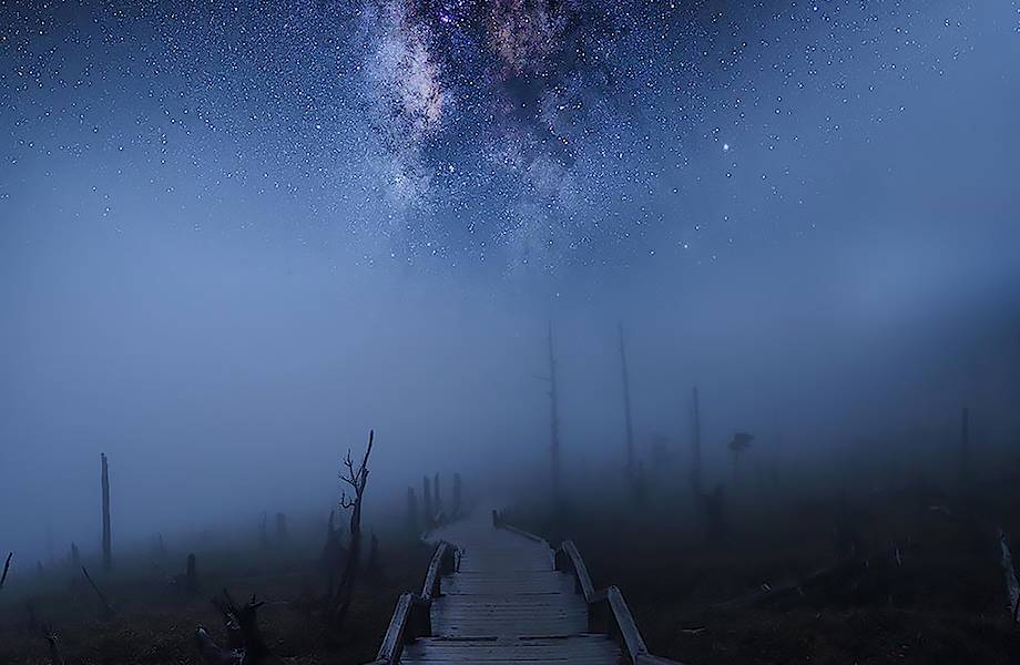 Рассказывая о том, как ему удалось сделать столь захватывающие кадры, Юаса описывает счастливые совпадения, которые привели его к идиллической картинке. Во-первых, во время съемки в округе не было ни души. Во-вторых, фотосессии посодействовала сама природа: густой туман и сильнейший ветер создали поистине пронзительную атмосферу. В какое-то мгновение туман развеялся и в самом центре кадра, прямо над тропой, обнажилось дивное ночное небо, будто космос разверзся. Стоит ли говорить, что японец только и ждал этого магического момента?
