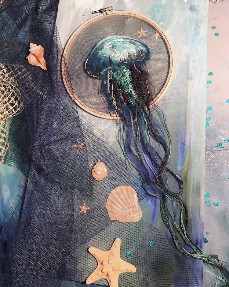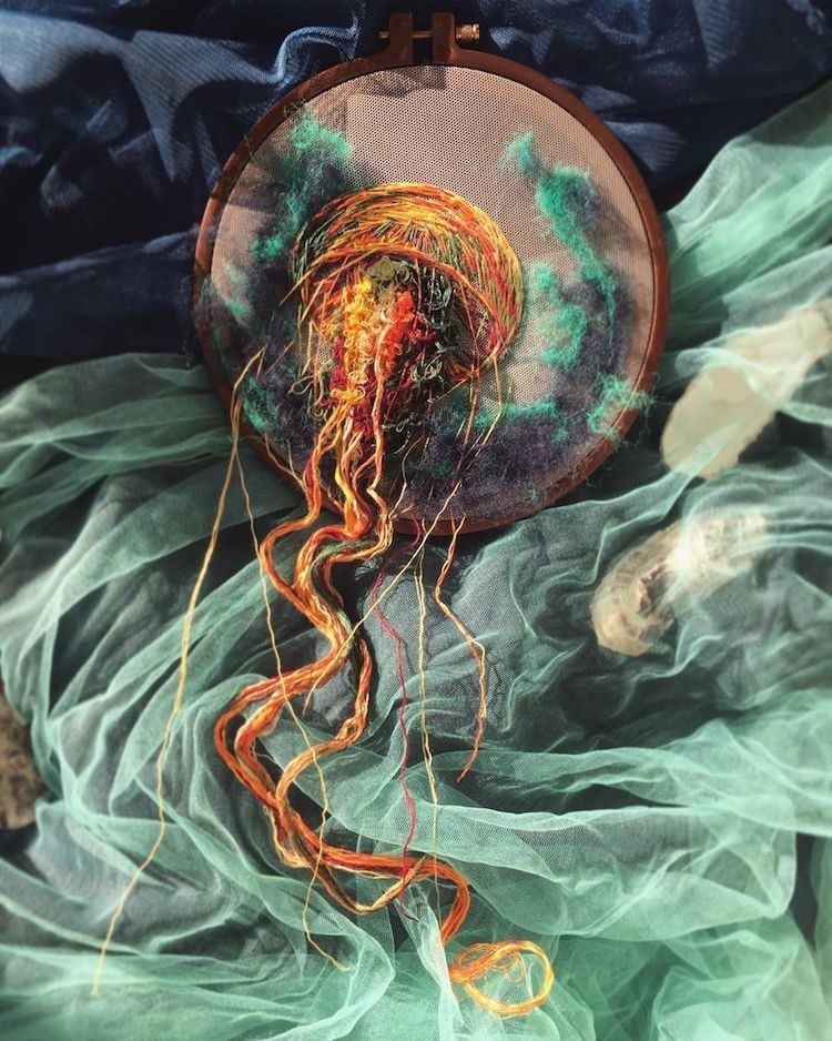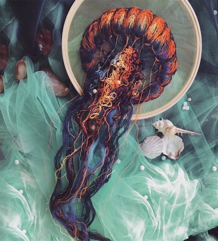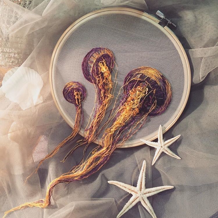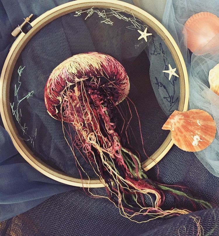 Современные вышивальщицы возродили вековое мастерство благодаря исключительному искусству ручной работы. А некоторые из них, такие как Юлия Кучеренко, способны выйти далеко за границы предложенного традиционными техниками. Ее вышивка в морском стиле изображает разноцветных медуз, будто проплывающих сквозь кольцо пялец.