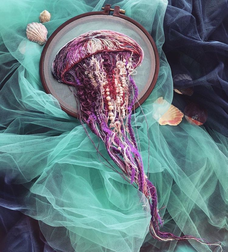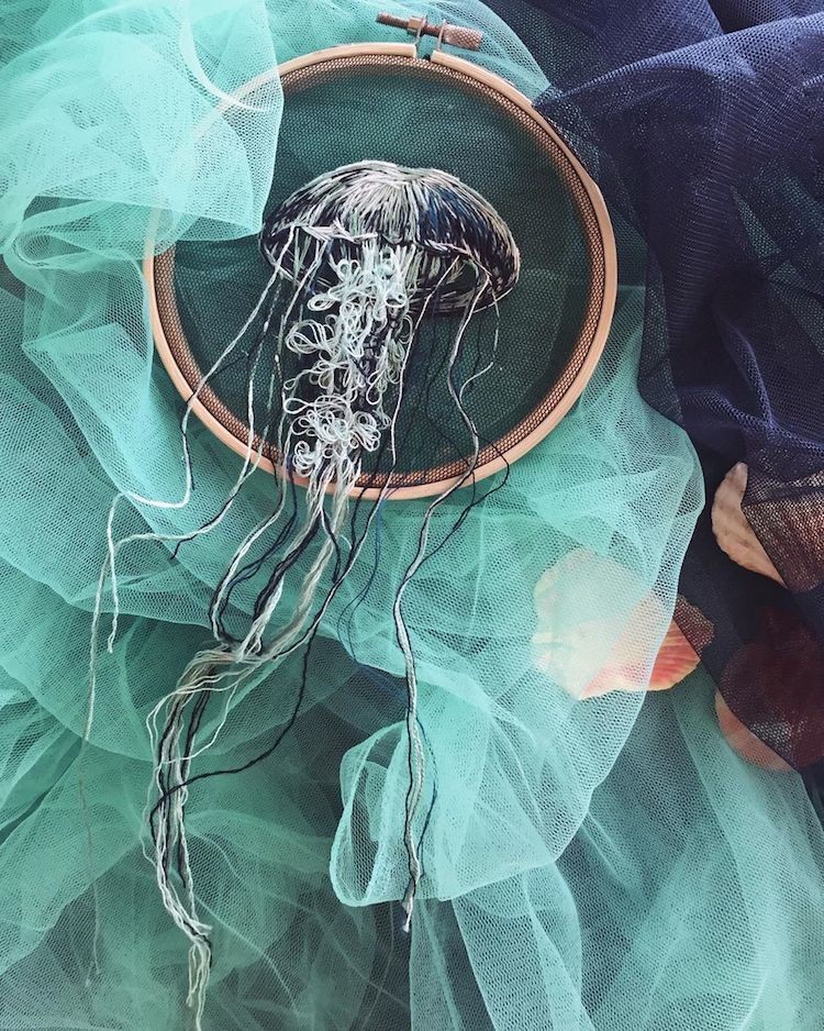 И хотя вышивка уже сама по себе производит на зрителя неизгладимое впечатление, Юлия демонстрирует креативный подход даже в фотографировании своего искусства: каждую медузу она укладывает на слои сине-зеленого тюля, имитирующие динамичные движения океана. Завораживающие рукотворные работы, вдохновленные необузданной, дикой природой!