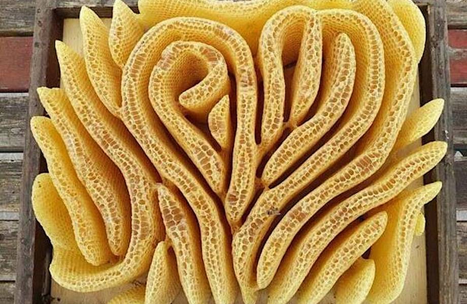 Этот улей выглядит довольно странно, но лишь потому, что мы привыкли видеть соты, выстроенные в прямоугольных рамках, которыми трудолюбивых насекомых снабжают пчеловоды. Такие прямоугольные формы позволяют фермерам легко вынимать восковые конструкции и извлекать из них мед. Реальность же такова, что в дикой природе, в условиях, неконтролируемых человеком, пчелы будут использовать все имеющееся пространство для хранения своего драгоценного продукта. Натуральные ульи могут принимать любые формы и размеры.
