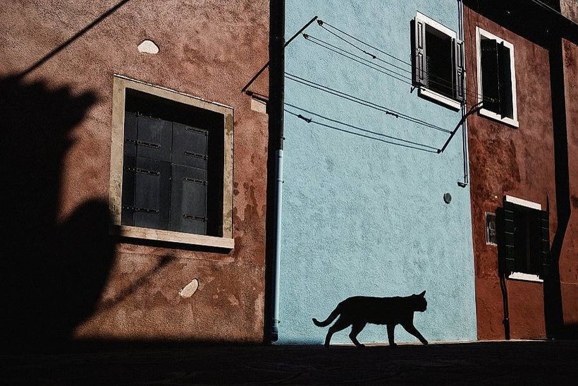 Не только тени людей на первом плане, но и тени самого города: развешенное белье, собаки и кошки, лодки, без которых местные жители вряд ли смогут обойтись.