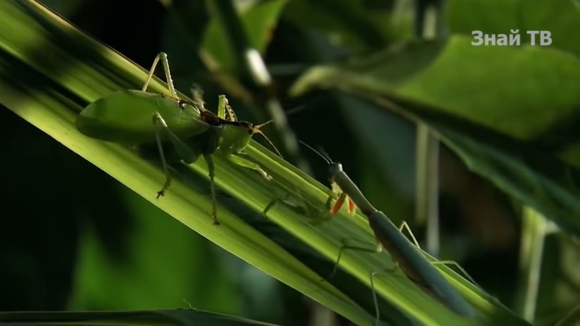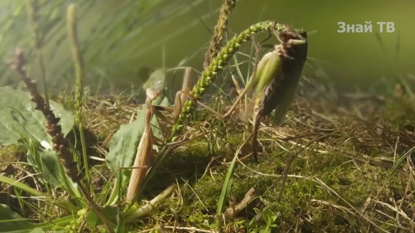 Богомол и кузнечик. Последние насекомые не совсем олицетворяют детский стишок «В траве сидел кузнечик…» и не кушают одну лишь травку. Они любят полакомиться свежим мясом не меньше, чем богомол. Поэтому встреча двух хищников обещает интересные повороты событий. Обычно схватка заканчивается вничью, противники просто расходятся. Но если кузнечик превосходит размером богомола, то он с легкостью победит.