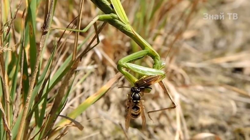 Богомол, шмель и шершень. Несмотря на то, что шмели и шершни больше ос в два раза, это не спасает жужжащих товарищей от коварного богомола. Он может побороть их, даже находясь вниз головой, повиснув на одной ноге.