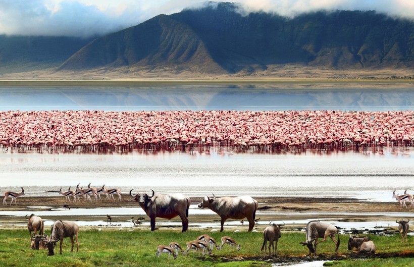 В этой гигантской чаше на протяжении тысячелетий формировалась особая экосистема. Огромные размеры и разнообразие рельефа привели к формированию разного микроклимата внутри Нгоронгоро, что способствовало формированию различных типов ландшафтов. Поэтому здесь можно наблюдать такое многообразие фауны. Сегодня здесь обитают около 25 тысяч различных животных, при этом в огромном кратере можно увидеть невероятно большое количество львов и других хищников.
