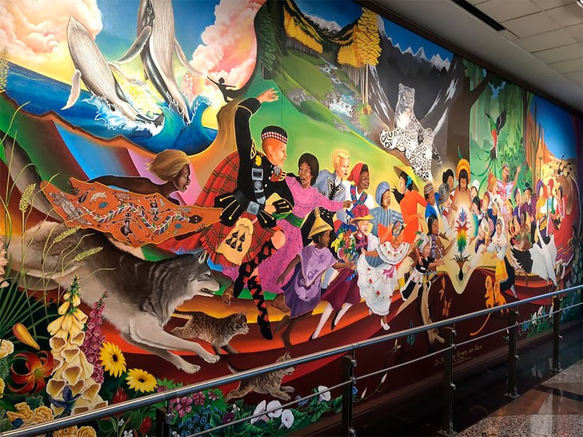 Мурал, размещенный в коридоре получения багажа, является одним из четырех выполненных одним и тем же художником. Все работы были созданы 25 лет назад во время строительства аэропорта. Четыре картины представляют собой на самом деле два полноценных произведения искусства. Одно из которых носит название «В мире и гармонии с природой — Дети мира мечтают о мире». На этом мурале изображена сцена с полыхающими в пламени деревьями и молодой женщиной, убегающей от огня с детьми.