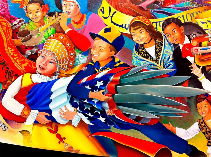 Изображение контрастирует со второй половиной картины, на которой счастливые дети разных культур и народов веселятся вместе с животными на празднике.
