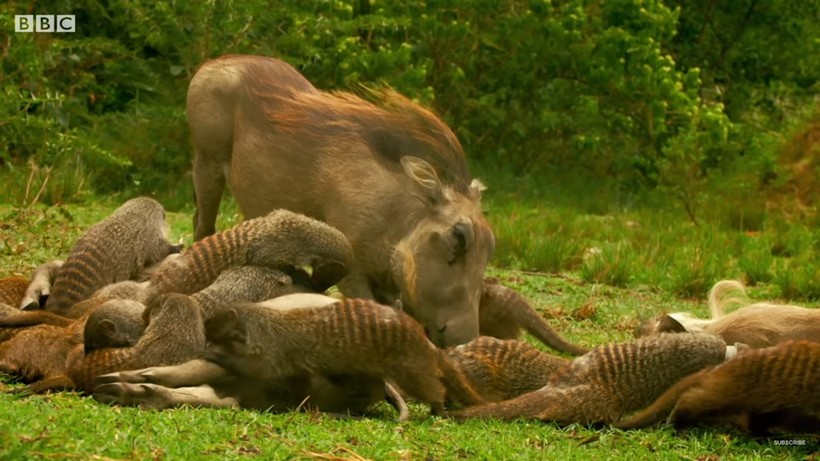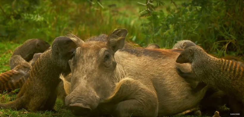 Видео, представленное ниже, рассказывает короткую историю из жизни львицы Джуа-Кали и ее потомства. Она и ее львята голодны, потому мать решила выйти на охоту. Вдали она заметила дикого кабана в окружении сурикатов. Такое соседство выгодно для обоих видов — множество пар глаз зверьков наблюдает за территорией, и кабан может расслабиться, если же враг нагрянет, то парнокопытное может защитить сурикатов и отогнать хищника.