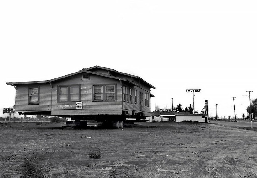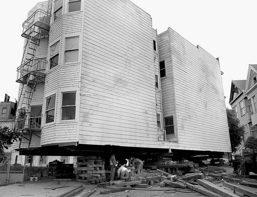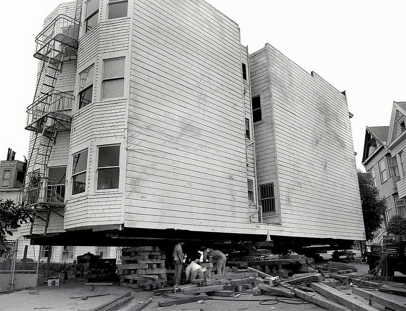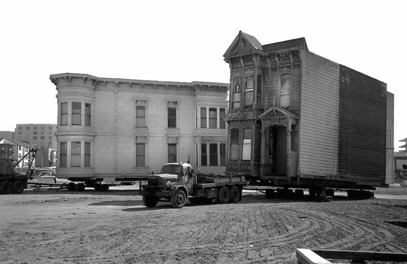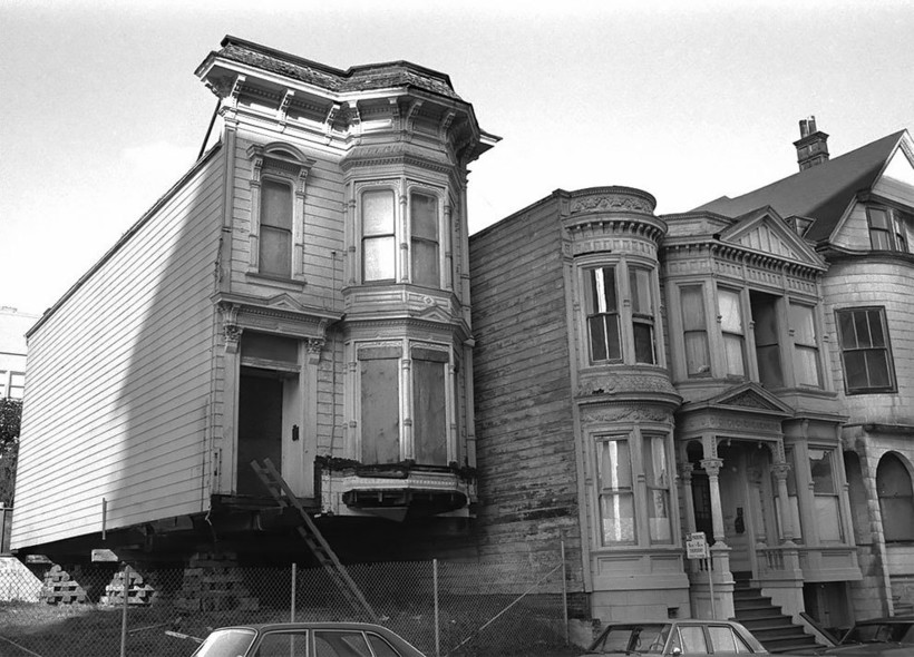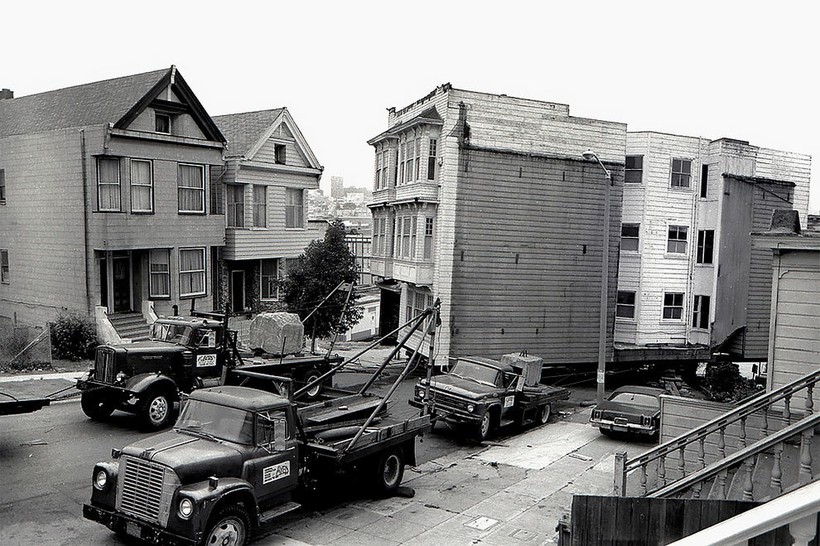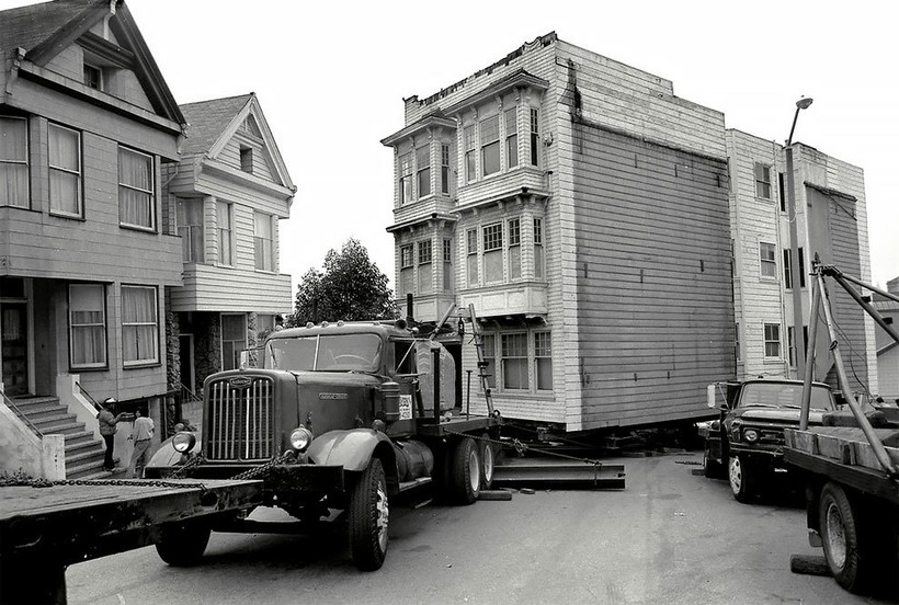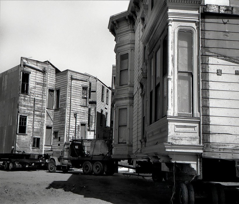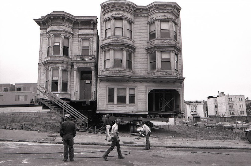 Фотографу Дейву Глассу посчастливилось заснять перевозку нескольких таких построек в Сан-Франциско в те времена. В рамках реализации проекта реконструкции города эти великолепные здания 19 века из района Вестерн-Эдишн в буквальном смысле этих слов «переехали» на новые адреса. Затем они были проданы по цене 1 доллар плюс затраты на переезд и ремонт. Гласс, родившийся и выросший в этом живописном и необыкновенном калифорнийском городе, сделал эти фотографии для своей черно-белой серии House Movers, San Francisco.