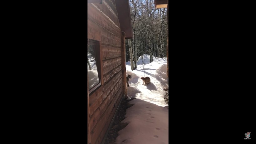 «Я живу в Ред Лодж, штат Монтана, в горах. Примерно в течение 10 минут я слышала что-то, напоминающее звуком большую корову. Когда я вышла на веранду, то увидела своего котенка Ари, он крупный на вид, но ему всего 10 месяцев. Питомец стоял напротив большой рыси и был готов броситься на незваного гостя, дабы защитить территорию. Рысь совсем не боялась кота и стояла на месте. Я не хотела напугать своего любимца, ведь если бы он погнался за рысью в лес, то мог там погибнуть. Поэтому я сделала несколько тихих звуков, чтобы привлечь внимание дикой кошки. Та, увидев меня, убежала в лес», — рассказывает свою история американка, снявшая видео, представленное ниже.