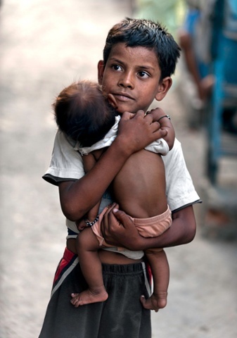 6-летний Вишал Сингх заботится маленькой девочке, пока ее мать отсутствует.