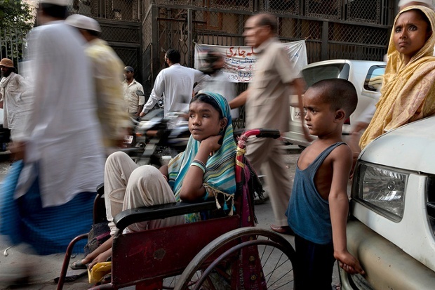 Эти двое детей — тринадцатилетняя Ханупа Бегум и шестилетний Хаджимудин Шейх — выпрашивают еду и деньги на улицах Нью-Дели. Девочка слепа, а ее брат страдает от избыточного скопления жидкости в головном мозге.