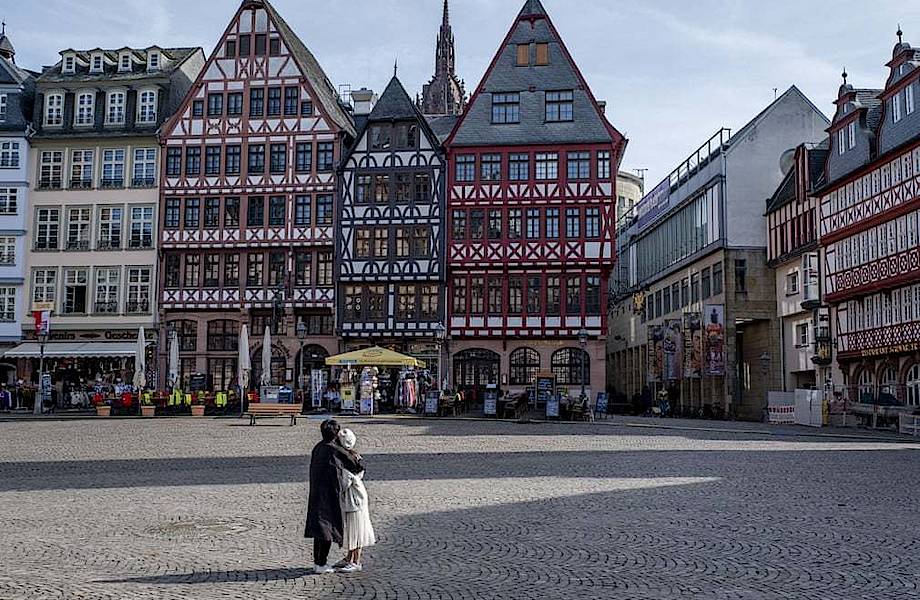 Пара обнимается на рыночной площади Рёмерберг ― главной достопримечательности Франкфурта-на-Майне, Германия.