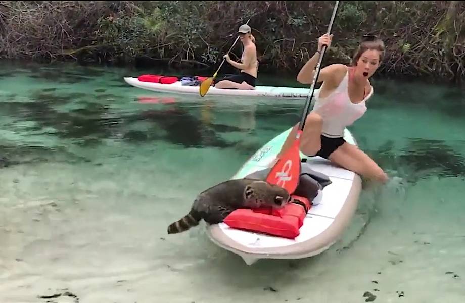 «Вероятно, это самый забавный момент моей поездки во Флориду. Это была моя первая встреча с диким и очень любопытным енотом. Я огорчена тем, что почти ударила его по голове, но я просто старалась держать его подальше от себя и моих вещей. Но когда он схватил мою одежду и еду, я без раздумий начала их отбирать. Как видите, он уплыл и был в полном порядке. Мы встретили его еще раз примерно часа спустя. Он снова попытался подойти к нам, ха-ха».