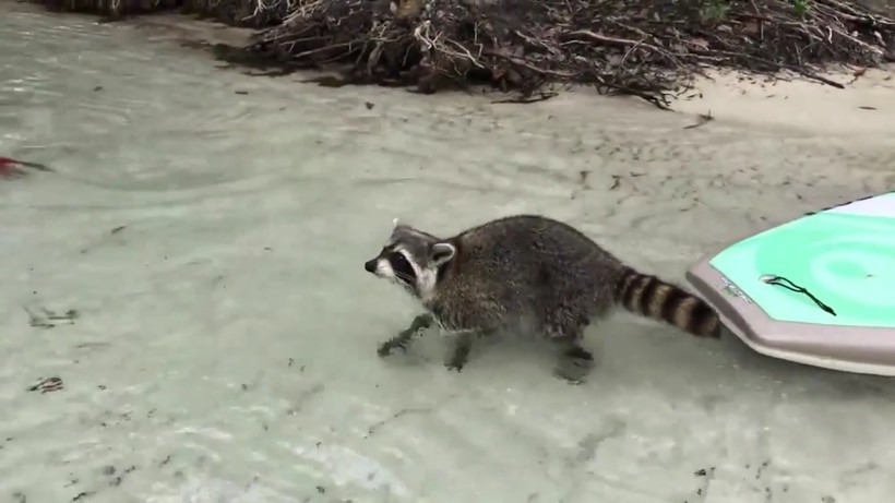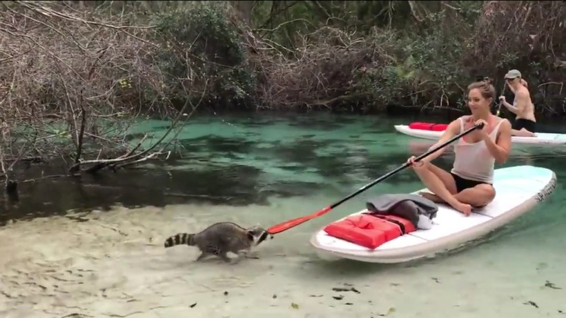 Во время плавания по мелкой реке молодые люди причалили к берегу, где их увидел енот. Зверь сначала походил по доскам под радостные возгласы друзей Джанны «Привет, приятель!», а потом направился к девушке и стал копаться в вещах, лежавших на ее борде. Туристка пыталась тут же отчалить от берега, но расторопный енот оказался намного быстрее. Джанна старалась аккуратно отогнать зверька веслом, но и это не помогло. Девушка спрыгнула в воду, но когда коварный воришка стал тащить ее сумку, то Бреслин стала ее отбирать. Силы были неравны, а потому победа осталась за человеком.