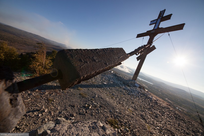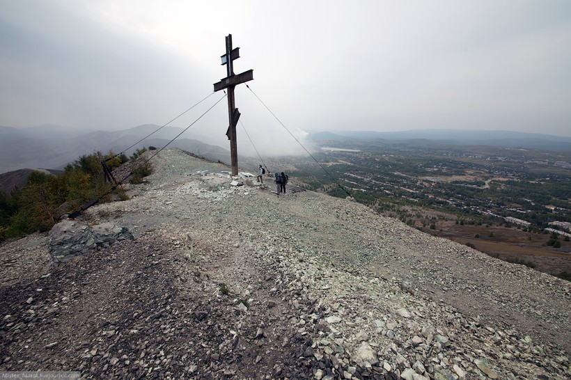 Решив сменить обстановку, я вместе с brock_msc и Антоном, коллегой по интересам, вместо привычных глазу альпийских лугов и живописной природы решил поехать в чрево российского индастриала — Челябинск. Такое решение весьма удивило моих друзей, ибо по России я практически не путешествовал до этого. Опущу подробности того, как меня пытались ограбить в поездке, как я постепенно проникался диаметрально противоположным поведением челябинцев, а перейду сразу к делу — нашей целью был Карабаш, печально известный своей тяжелой экологической ситуацией город, увядающий на глазах. Еще будучи «на берегу», мы попросили знакомых, живущих неподалеку, показать нам город и его самые интересные места. Таким человеком оказался Саша — предельно спокойный и рассудительный парень, который с удовольствием решил провести нас по городу и окрестностям. Карабаш встретил нас отвратительной погодой, которая смогла еще больше погрузить нас в атмосферу декаданса. Первой остановкой стала так называемая «Лысая гора», вершину которой венчает огромный 15-метровый крест.