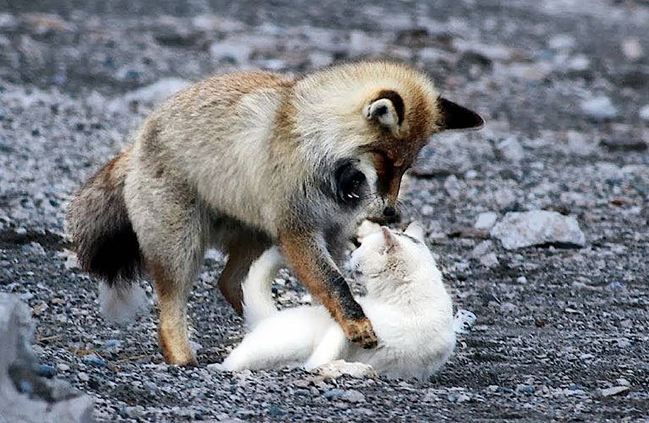 Вот уже несколько лет на побережье озера Ван, расположенного в 25 километрах от небольшого турецкого города, местные жители любуются необычной парочкой — дикой лисой и ванской кошкой. Впервые этих животных случайно заметил один рыбак, когда расставлял удочки на берегу водоема. Поначалу он подумал, что хищница намерена съесть маленькое создание, но, понаблюдав, понял, что звери всего-навсего весело играют. Рыжая представительница семейства псовых делила с кошкой обед и ласково терлась о нее носом.