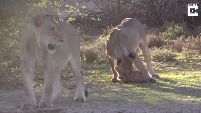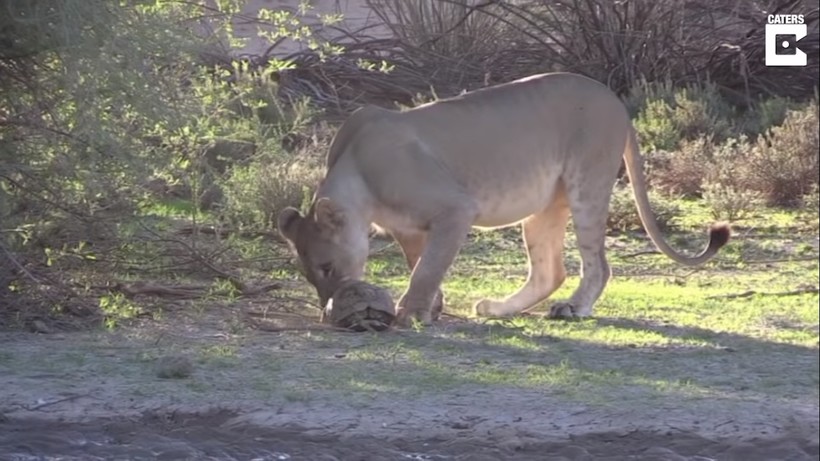Нередко можно увидеть, как молодые особи, еще не имеющие опыта в охоте, пытаются попробовать на вкус мясо черепахи. По незнанию они могут тратить впустую целые часы на то, чтобы достать добычу из крепкого панциря, пока утомительное занятие не разочарует их. На видео, снятом туристами в парке Кгалагади, запечатлен как раз такой момент. Многочисленные попытки хищников откушать черепашьего мяса одна за другой терпят неудачу. Рептилия укрылась в своем надежном доме и не покинула его, пока львы не оставили ее в покое. Некоторые черепахи могут достигать почти 20 килограммов, что не может не соблазнить проголодавшихся кошек попытать удачу.