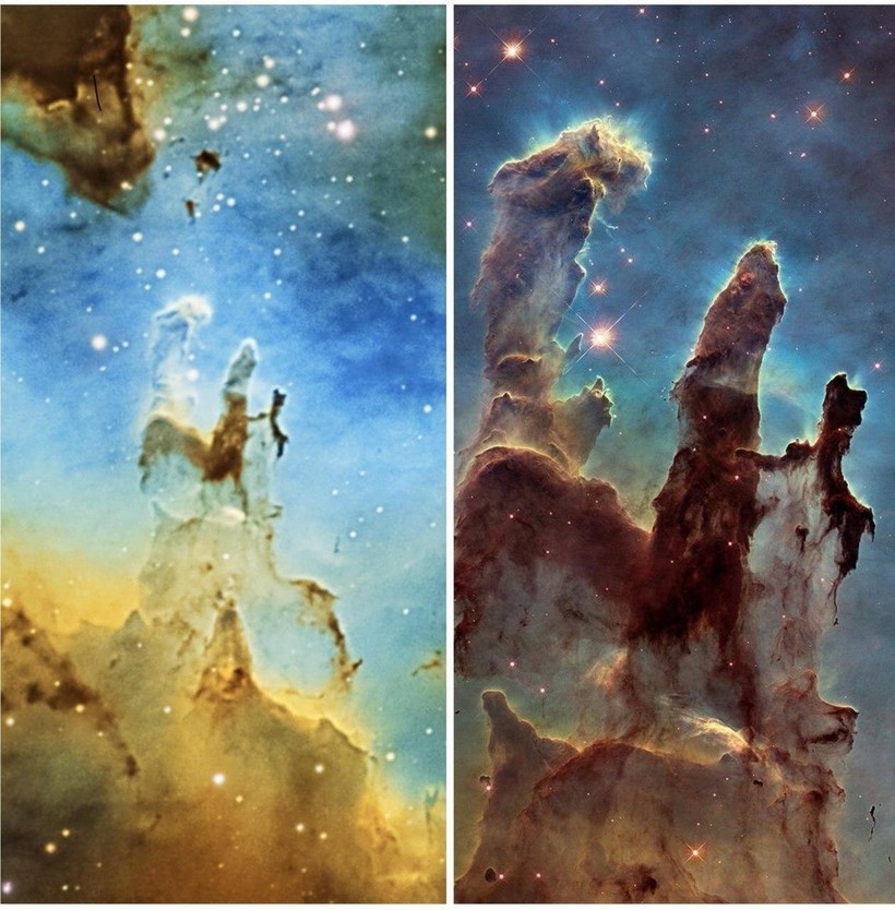 Разница между снимками космической туманности, сделанными при помощи любительского телескопа и автоматической обсерватории «Хаббл» на земной орбите.