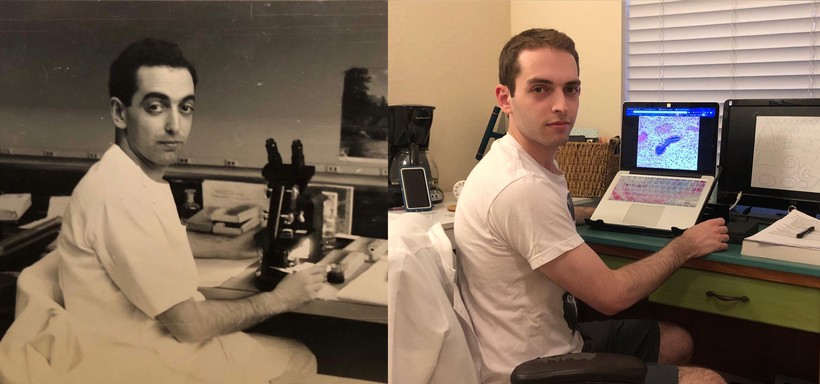 Между этими фотографиями, сделанными в медицинском учебном заведении, разница целых 70 лет — молодой человек, решил пойти по стопам своего деда.