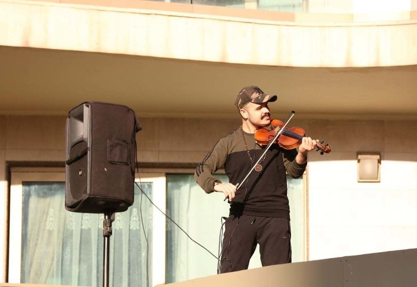Мужчина играет на скрипке, чтобы поднять настроение соседям. Берлин, Германия.