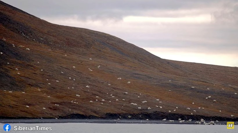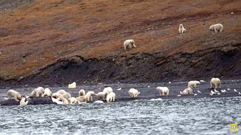 В 2017 году пассажирский корабль проплывал вблизи острова, когда люди заметили на берегах вдали много белых движущихся пятен. С огромного расстояния было не рассмотреть, и туристы решили, что это пасутся овцы или козы. Когда же корабль приблизился к острову, удивлению людей не было предела — на берегу находилась пара сотен белых медведей: самки, самцы и медвежата. Обычно эти звери одиночки и редко собираются группами, но в этот раз был исключительный случай. Оказалось, что в этом месте выбросило на берег тело гренландского кита. Медведи, как любители падали, учуяли запах большой «рыбы» и пришли полакомиться китовым мясом.