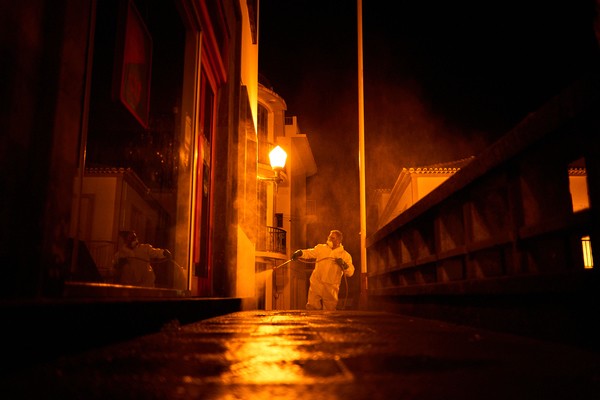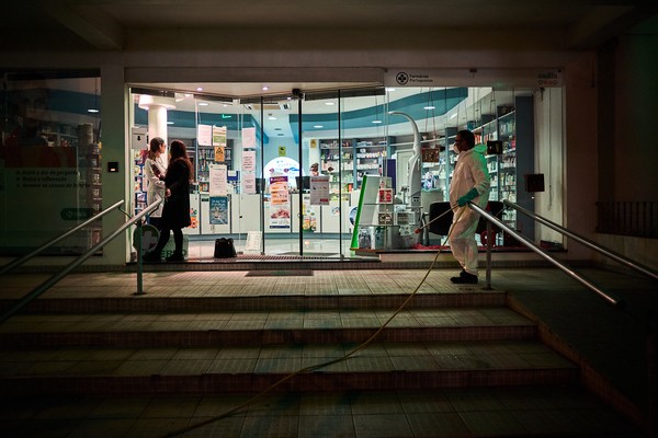 Мужчина ждет, когда от аптеки отойдут покупатели, чтобы продолжить дезинфекцию улиц