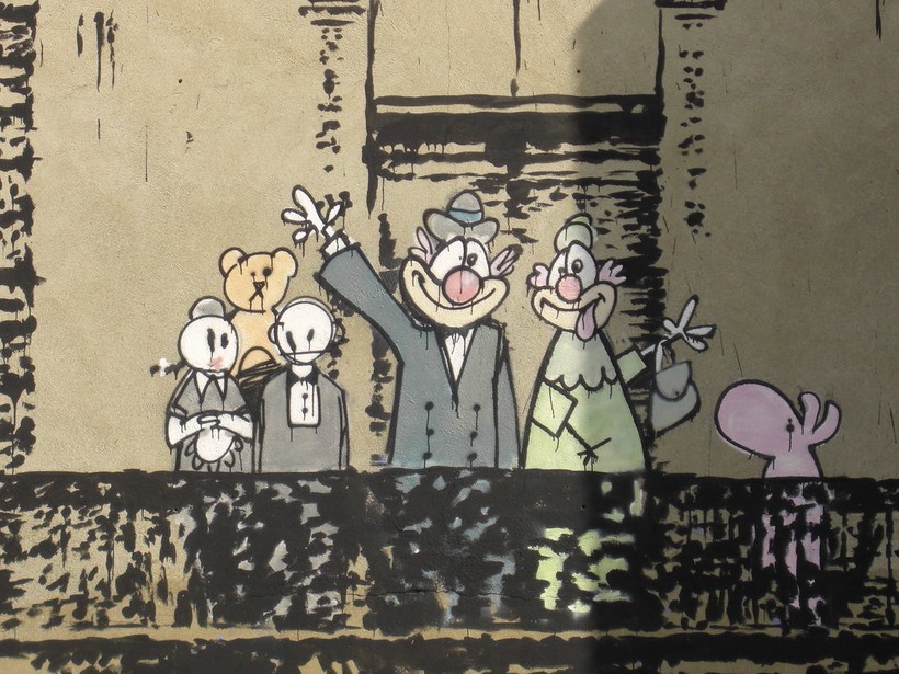 Карикатура на королевскую семью, приветствующую народ Великобритании, украшает здание Лондона уже много лет. Как-то городской совет даже пытался ее закрасить, но вовремя вмешался владелец здания.