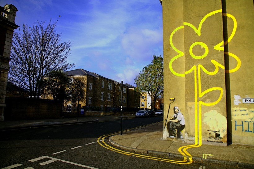 А вы когда-нибудь представляли в своем воображении, как выглядит художник дорожной разметки? Бэнкси представил. Yellow Lines Flower Painter (Художник желтых линий) очень органично вписывается в улицу: это цветок, от которого продолжаются полосы дороги. Правда, граффити уже покрыто более свежими рисунками, но все же работа Бэнкси прекрасно видна.