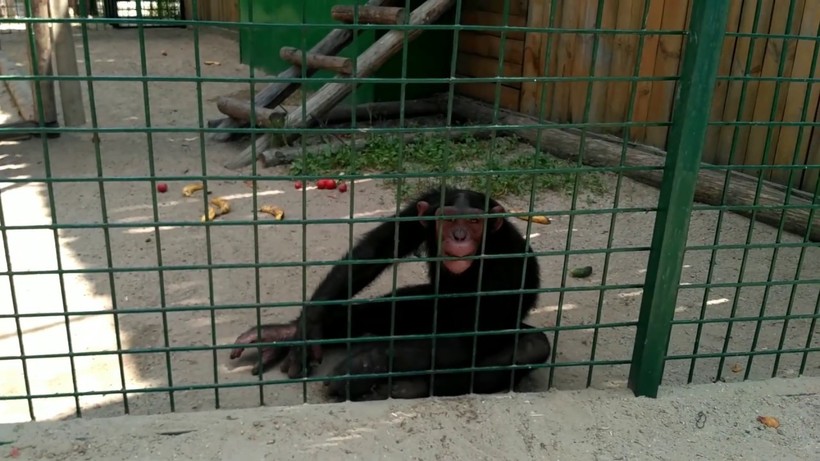 В зоопарках, где шимпанзе находятся в ограниченных по численности группах, они часто идут на контакт с посетителями. В современных зоопарках людей и обезьян разделяет толстое непробиваемое стекло. Через него не только мы наблюдаем за животными, но и они наблюдают за нами. Близость людей и шимпанзе провоцирует частые контакты, взаимное любопытство, заигрывания. Чаще всего это легкие удары по стеклу, махи руками, прыжки, пинки, поглаживания, «поцелуи». Наблюдения в зоопарке показали, что репертуар подражаний человека был намного шире обезьян. Например, обезьяны отказывались копировать позы человека. Но в целом готовность начать контакт с помощью подражания примерно одинакова как у «них», так и у «нас». В этом коротком ролике мы видим как раз такой случай.
