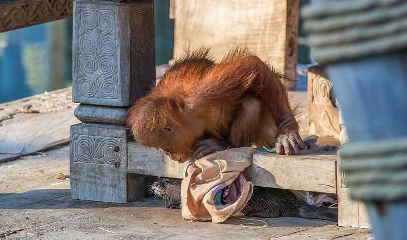 Через зоопарк протекает река как раз по «Царству Ганеши» ― саду индонезийской фауны и флоры, где, собственно, и живет семья орангутанов. Территория, где проживают 24-летний Уджянь, 15-летняя Сари и их четырехлетний сын Берани, находится на берегу реки. Некоторое время назад к пушистому семейству повадились ходить в гости выдры. Они вылезают из воды, чтобы специально поиграть со своими большими друзьями. В особенности в восторге от этой дружбы Уджянь и Берани, кажется, у них особая связь.