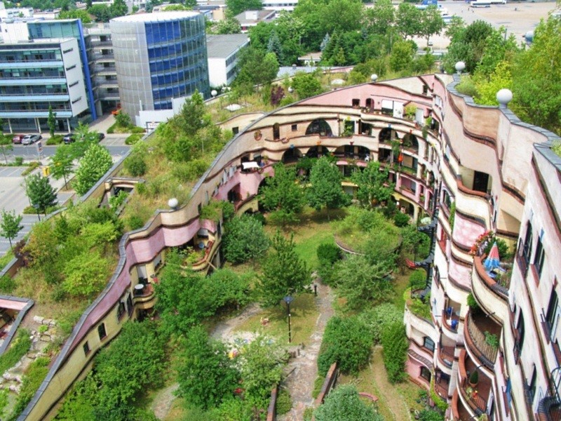 Автором этого 12-этажного дома в виде гигантской улитки является австрийский архитектор Фриденсрайх Хундертвассер. В 105 квартирах нет ни единого угла, и даже двух одинаковых окон здесь не найти, а на крыше растут деревья.
