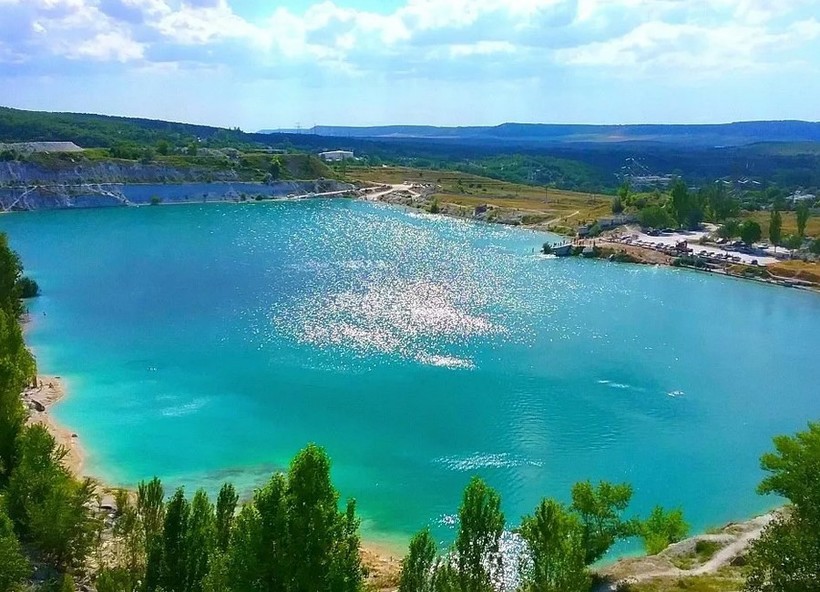 Мраморное озеро в Крыму, которое называют также Марсианским. Оно появилось на месте известнякового карьера, именно поэтому водоем такой правильной прямоугольной формы.