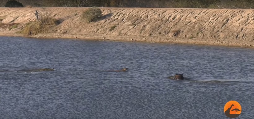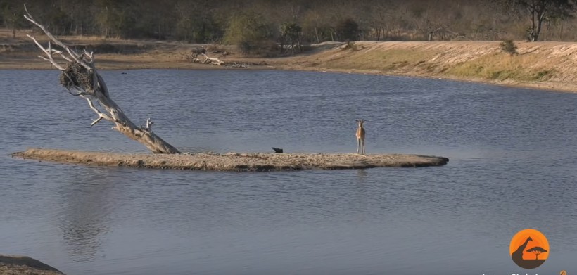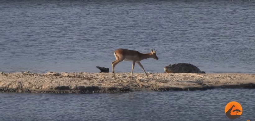 В представленном ролике запечатлена удачная охота крокодила на антилопу. Импала бродит на маленьком островке посреди реки. Она боится плыть, потому что в реке ее ждет крокодил. Крокодилу же надоедает ждать, и он медленно выползает на берег, чтобы ускорить получение своего обеда. Тогда антилопа совершает максимально большой прыжок в сторону берега и плывет изо всех сил, надеясь успеть. Однако здесь в сюжет вступает еще один герой — наперерез копытному бросается бегемот. Вопреки расхожему мнению, что бегемоты — травоядные животные, они на самом деле не брезгуют падалью. Все трое стремительно уходят под воду. У антилопы нет шансов. Вскоре выныривает раздосадованный бегемот. Судя по отсутствию антилопы, она досталась крокодилу.