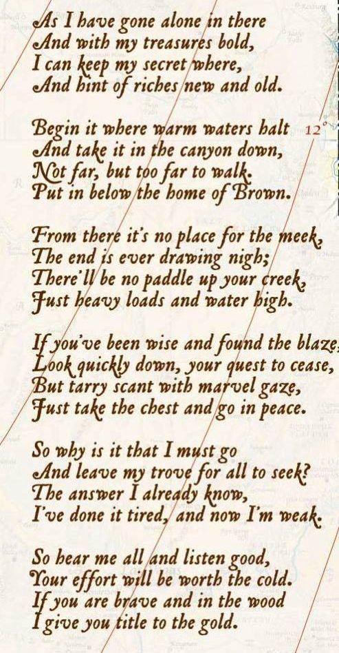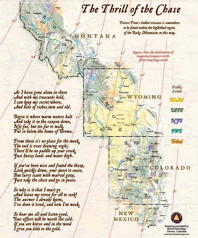 Доподлинно неизвестно, когда точно пожилой американский гражданин спрятал сундук с сокровищами, но мир узнал о нем в 2010 году, когда в свет вышла его книга. На страницах своего автобиографичного произведения «Страсть погони» Форрест Фенн не только поведал читателям этапы своего жизненного пути, но и разместил стихотворение, в котором содержатся подсказки. По мнению самого Фенна, найти клад очень легко, достаточно лишь внимательно прочитать текст и все встанет на свои места.