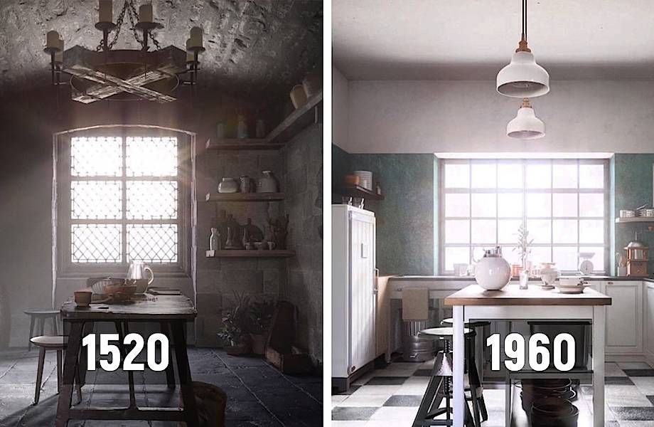В нашем мире все изменчиво. Это касается не только человеческой жизни или моральных аспектов, но и технологий. С каждым годом они прогрессируют, заменяя привычные нам вещи более современными. К примеру, первая микроволновая печь появилась в 1947 году, а стала активно продаваться только в 1970-х. В России же она появилась менее 50 лет назад, во времена СССР. Сейчас же почти в каждом доме есть эта чудо-техника, позволяющая греть и готовить пищу без плиты. В видео, представленном ниже, компания HomeAdvisor сделала компьютерную визуализацию эволюции одной кухни, начав с 1520 года — времен Тюдоров — и заканчивая современным американским дизайном. Специалисты показали, как же кардинально изменился быт человека за пять сотен лет.