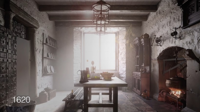 В 16 веке кухня в усадьбе была темной и грубой — каменная кладка на стенах и потолке, отсутствие мебели за исключением стола и табуретов. Вся еда готовилась в дровяном камине, а посуда была из олова и меди. Простая свечная люстра дополняет картину. В 17 веке наступила эпоха Стюартов, но многое изменилось, и кухня стала более уютной и теплой — потолок обшит деревом, стены покрыты светлым известняком, а из мебели появился шкаф для посуды, которая, кстати, стала глиняной и керамической. Да и камин стал более совершенным — вместо дров применяли угли и вертел для жарки.