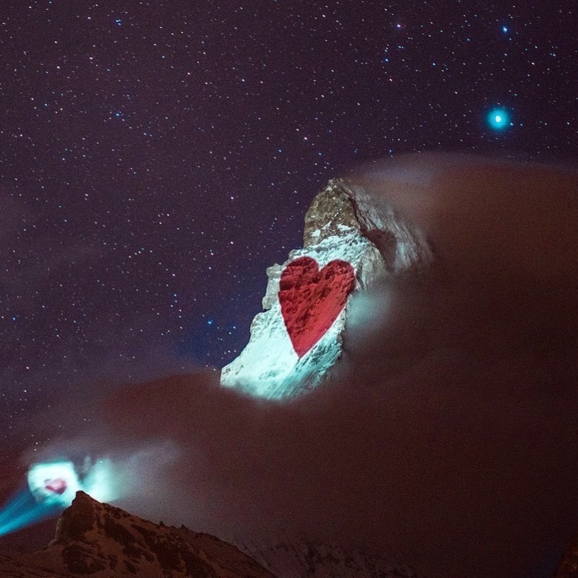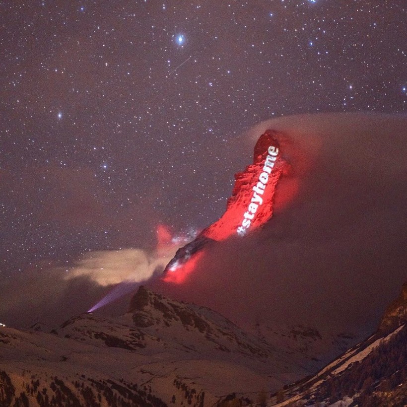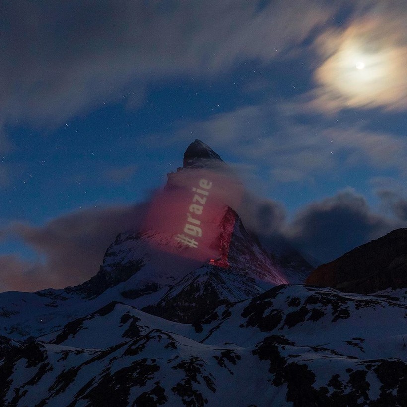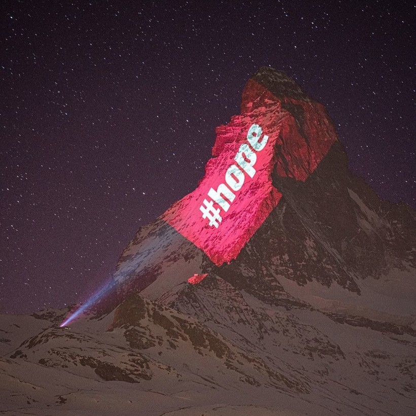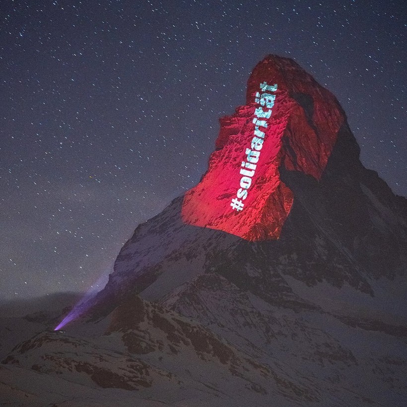 Вместо того, чтобы поднимать флаги на флагштоке, Швейцария отдает дань уважения другим странам мира, борющимся с COVID-19, проецируя флаги государств на Маттерхорн — самую знаменитую и культовую гору Альп. Проектом руководит швейцарский художник по свету Джеффри Хофштеттер. Он разработал схему освещения пирамидального пика горы высотой 4478 метров, простирающейся между Швейцарией и Италией. Каждую ночь на вершине появляется впечатляющее изображение флагов разных стран, борющихся со смертельной инфекцией, и подбадривающие слова для них.