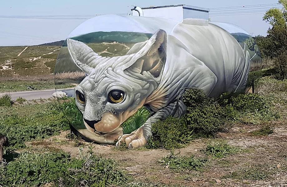 Одно из недавних самых ярких его творений — кот-сфинкс огромных размеров, которого художник решил разместить посреди пустынной местности, что делает эту работу еще более впечатляющей. В качестве полотна Braga выбрал весьма оригинальный объект — старый огромный бензобак. Когда француз закончил творить, бак исчез, а вместо него на обочине дороги появился гигантский серый сфинкс, будто пытающийся спрятаться в траве. В своих уличных работах Брагадо работает в технике, которая называется аэрографией. Это сюрреалистический метод, позволяющий добиться объемности и реалистичности изображения.