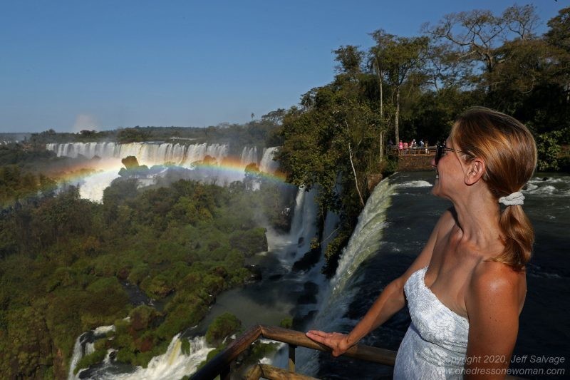 У водопадов Игуасу в Аргентине. И платье великолепно даже после того, как Дженнифер вытаскивает его из рюкзака.