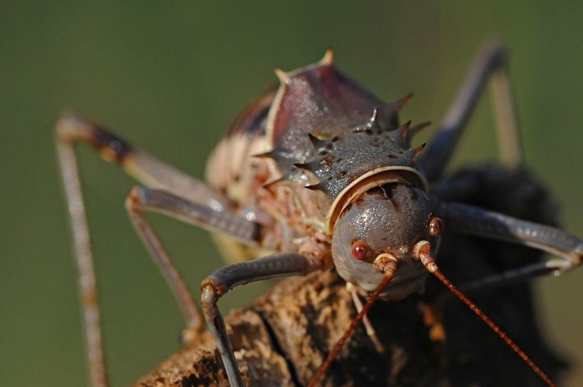 Эти кузнечики совсем не похожи на наших милых зелененьких насекомых. Их тело покрыто плотной броней с шипами, у них мощные челюсти, способные легко прокусить палец человека, а в случае опасности из-под панциря изливается едкая токсичная жидкость. Это обитатель пустыни Калахари — бронированный кузнечик.