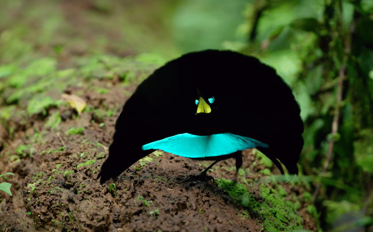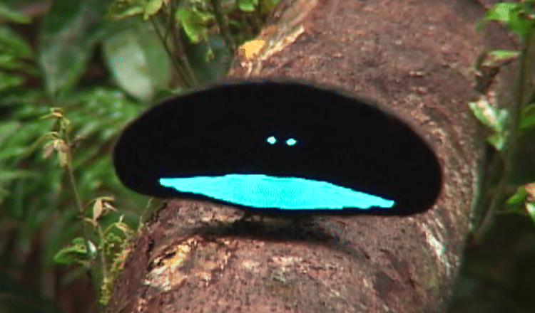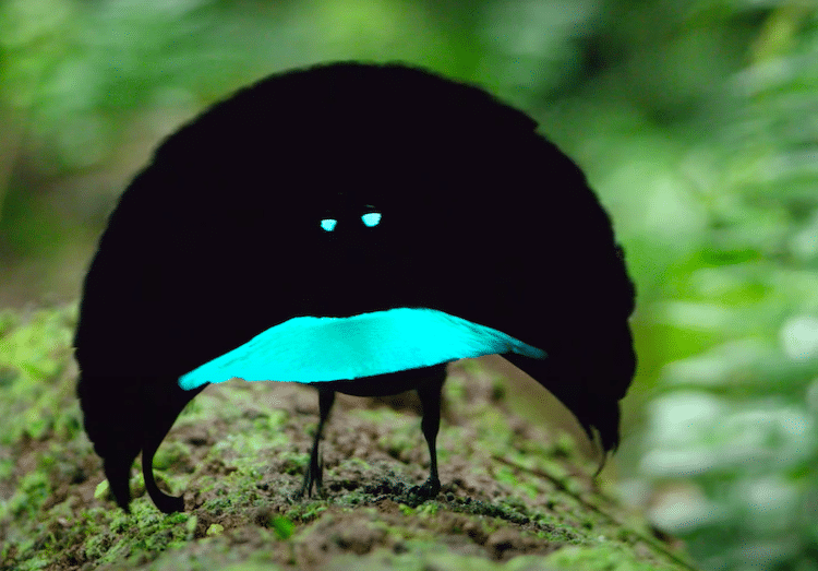 Оба вида имеют невероятно черное оперения. Его цвет настолько темный, что поглощает 99,95% света. Это обеспечивает впечатляющий контраст, когда во время брачных танцев птица демонстрирует ярко-бирюзовые отметины. Поистине незабываемое зрелище!