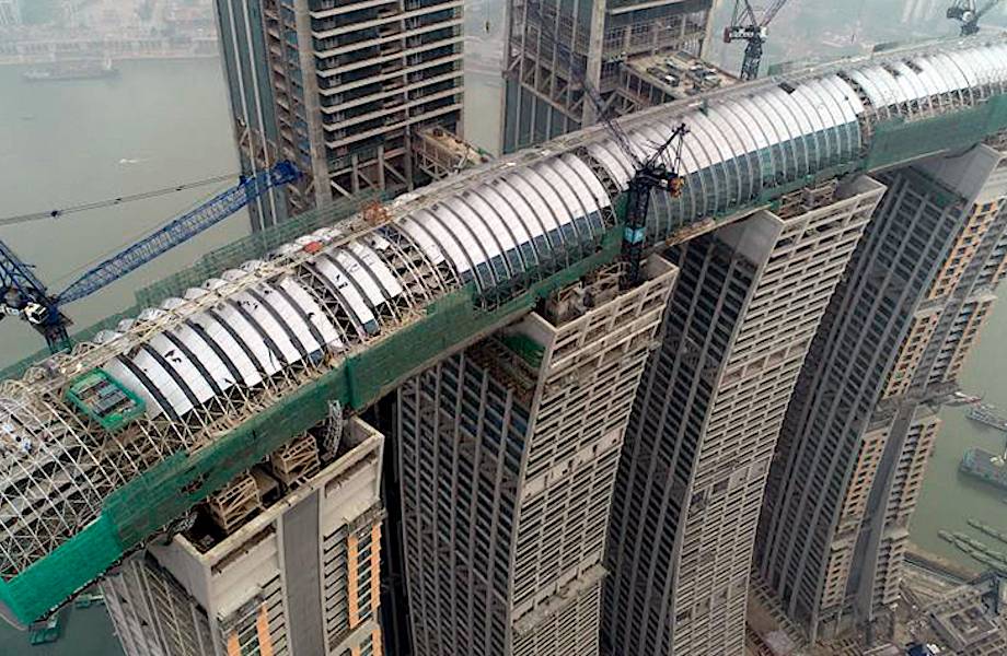 В верхней части этих высоток проложена горизонтальная труба около трехсот метров в длину. Такой, можно сказать, горизонтальный небоскреб одновременно является подвесным мостом и огромной смотровой площадкой. Также здесь будут располагаться сады, бассейны, отели, спа и тренажерный зал. Основа подвесного моста — это сталь и алюминиевые панели. В последние годы в Китае сформировалась своего рода мода на высокие постройки. Возможно, рост городов вверх компенсирует нехватку площади для проживания. Уже сейчас в Китае построен второй по высоте дом в мире и первый по высоте подвесной мост.
