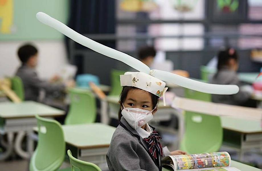 Необычные головные уборы придумали в одной из школ города Ханчжоу. Перед выходом с карантинных каникул учителя дали домашнее задание родителям — требовалось изготовить шляпы с двумя метровыми выступами с разных сторон. Теперь дети ходят в них на уроки.
