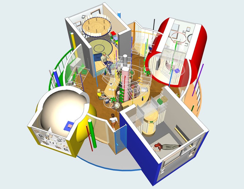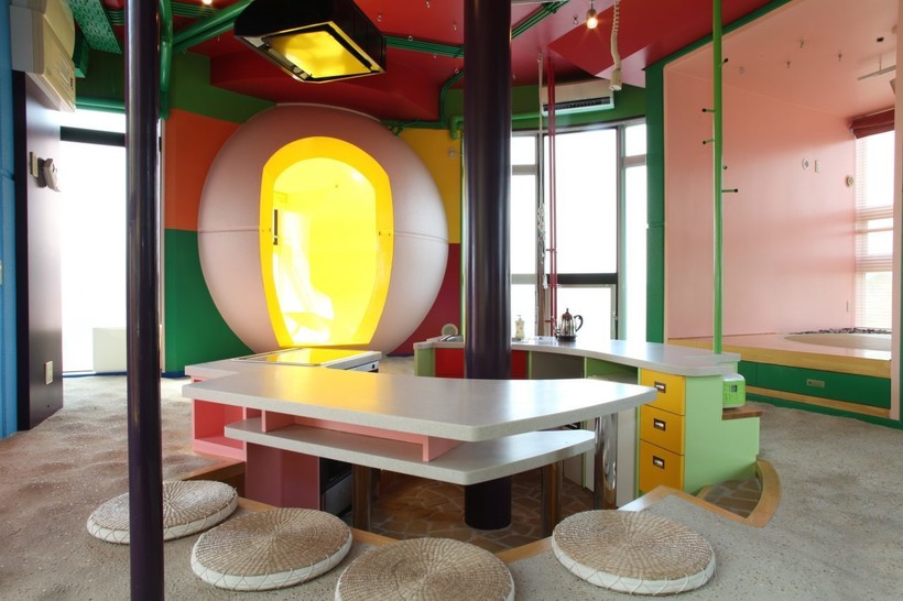 Через некоторые дверные проемы можно пройти, только если согнуться или повернуться боком. Полы тоже не дают расслабиться: причудливые выступы, неровности и пороги в совершенно неуместных местах заставляют внимательно смотреть под ноги. Здесь есть розетки, которые свисают с потолка — невообразимое зрелище. Но зачем архитектор придумал все это нелепое, на первый взгляд, разнообразие форм и расцветок?