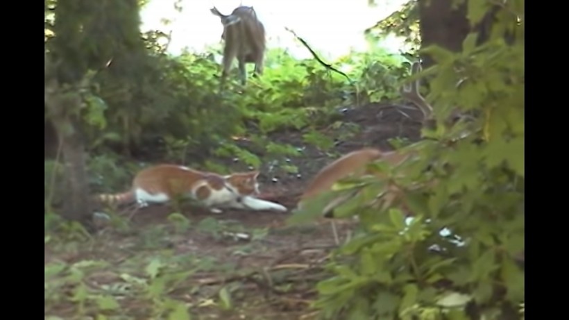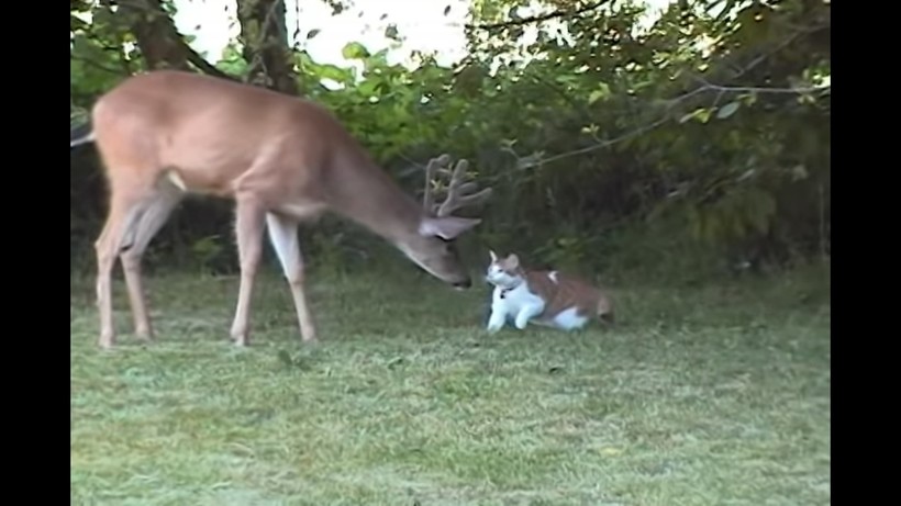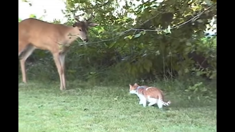 Домашний кот заприметил оленя в саду и решил подойти к большому животному. Олени привлекают кошек тем, что от них не исходит агрессии, как от хищников, нет суетливых движений и громких звуков, как от собак. Коты — это любопытные существа, и герой ролика не исключение. Он подошел близко к оленю и сел рядом, позволяя большому и рогатому зверю себя обнюхать. Похоже, что сохатый тоже впервые видит кошку, потому что был очень осторожен, но проявлял заинтересованность. Когда животные поняли, что они безопасны друг для друга, олень лег в кустах, а рыжий кот решил дотронуться до «неведомого» зверя.