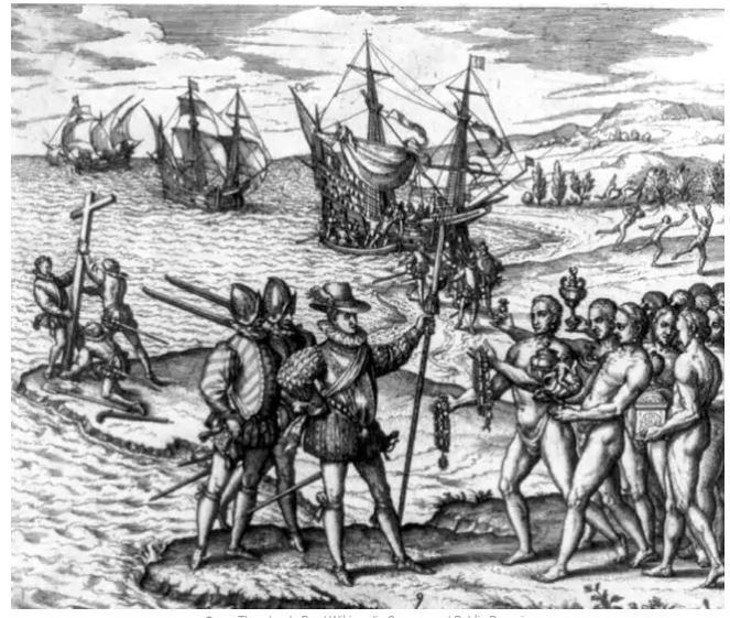 Как только Колумб сошел на неведомые земли, он повел себя как типичный работорговец и проповедник меча. Первыми аборигенами, которых он встретил на Сан-Сальвадоре, были араваки (также называемые таино), местные жители Багамских островов. Они приняли экспедицию Колумба мирно, а тот без раздумий взял некоторых из них в плен, чтобы узнать, где находятся месторождения золота на Востоке. Испанская колонизация для араваков обернулась трагедией. Через пятьдесят лет они почти полностью исчезли.