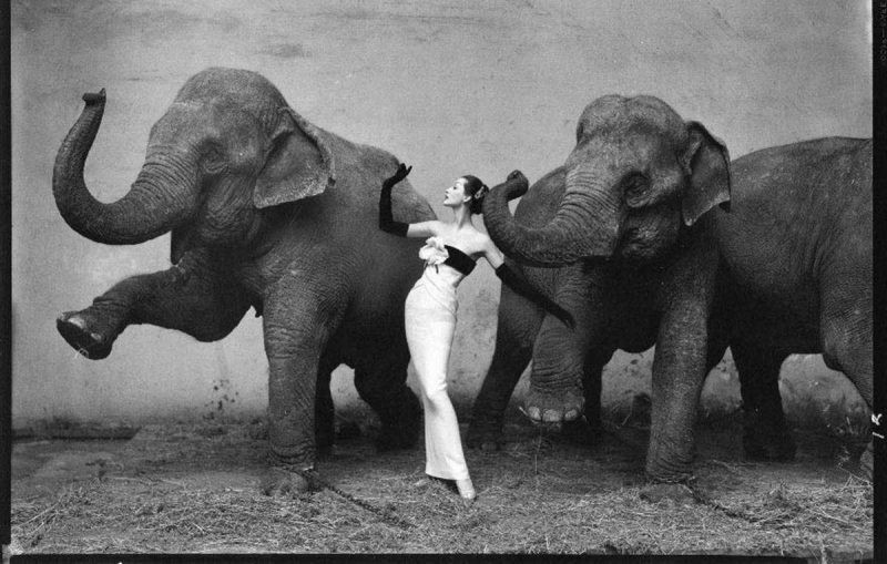 На первый взгляд «Довима со слонами» представляет собой невероятно красивый кадр со статной моделью в изящном платье и поясом из струящегося шелка. Однако это лишь на первый взгляд: красота Довимы и платья Dior обезображены слонами, закованными в цепи, которые словно в знак протеста пытаются отстраниться от прекрасной девушки. У этой фотографии есть и другое название, закрепившееся в СМИ: «Красавица и чудовище». Только вот кто именно в кадре монстр, остается решить зрителю.