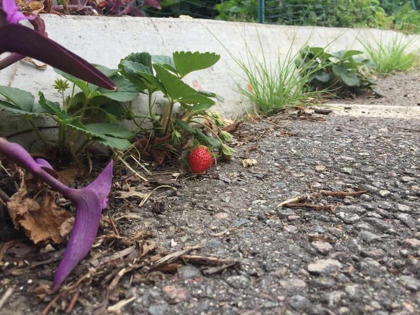 Клубника поселилась в канаве, выросла в маленькой щелке бетона и, кажется, отлично себя чувствует.