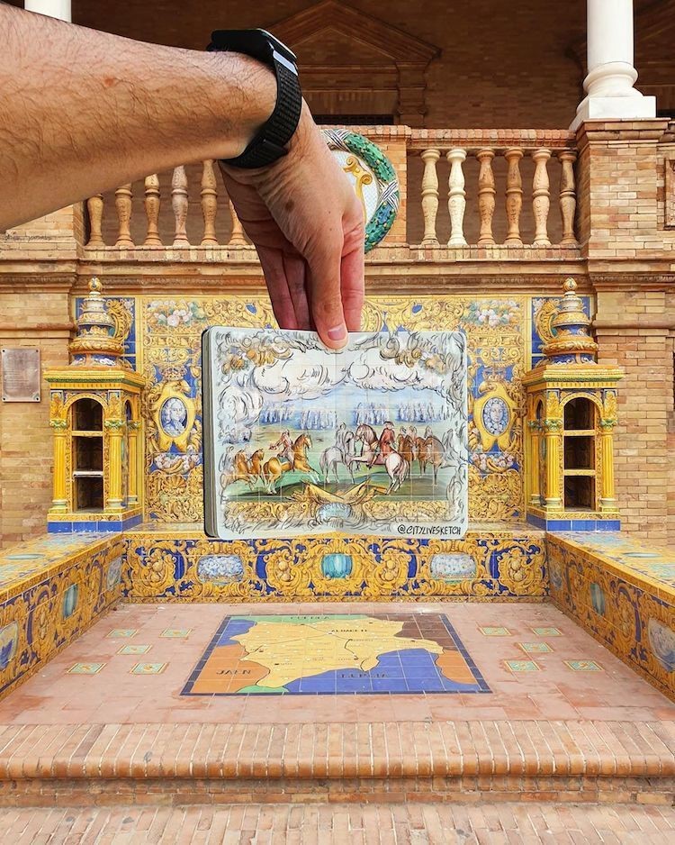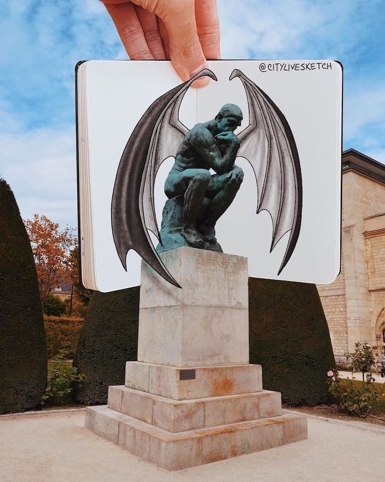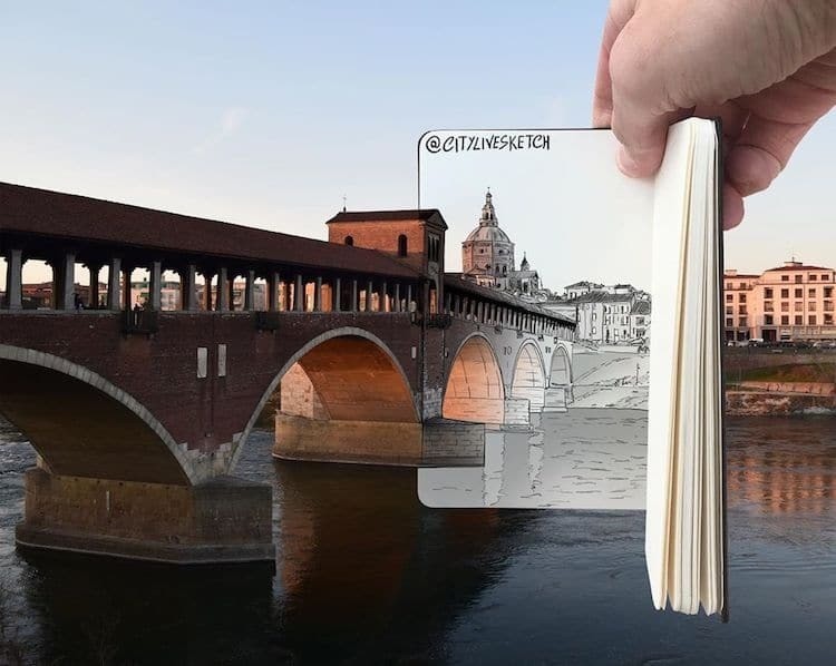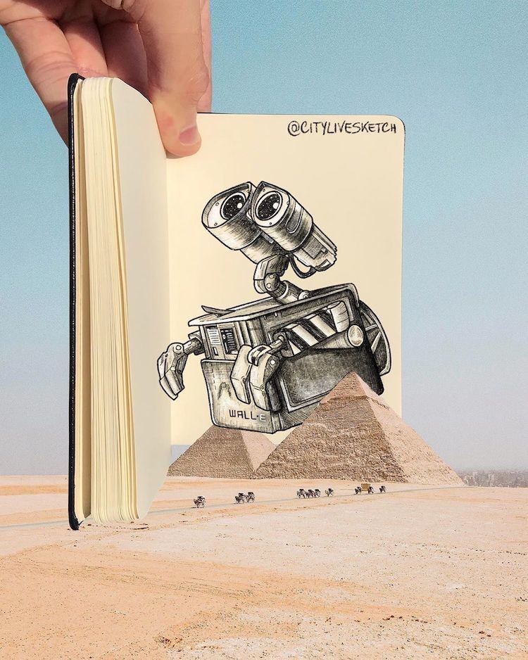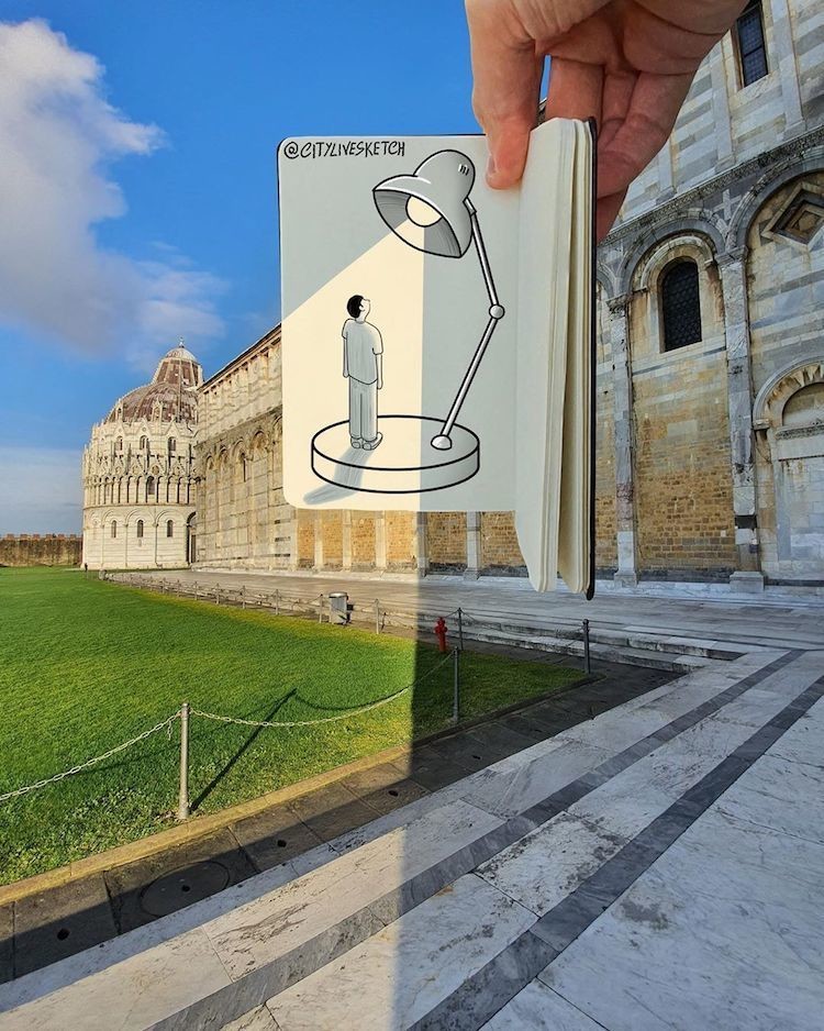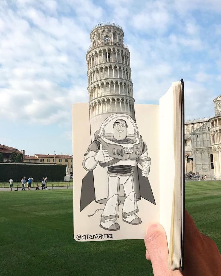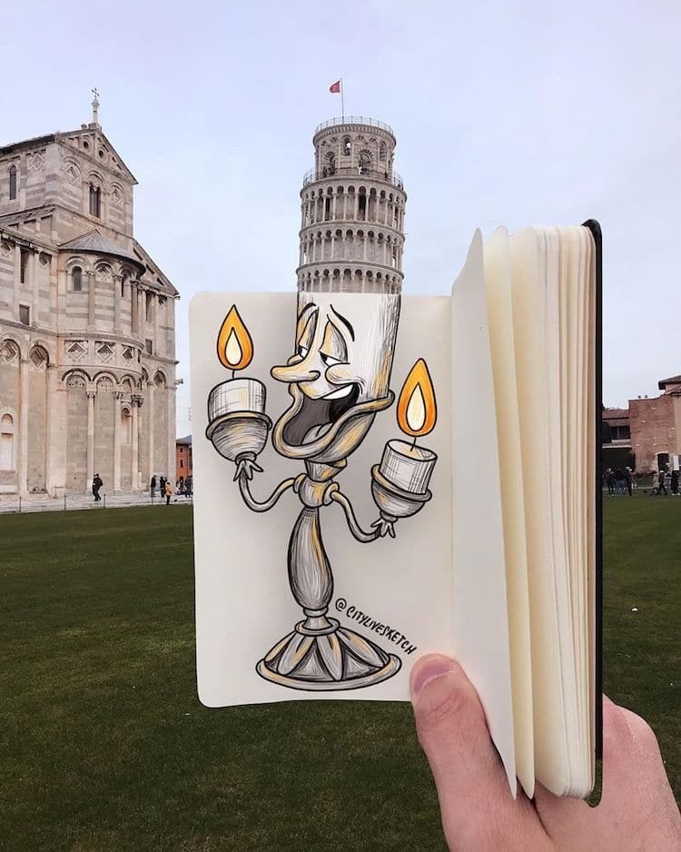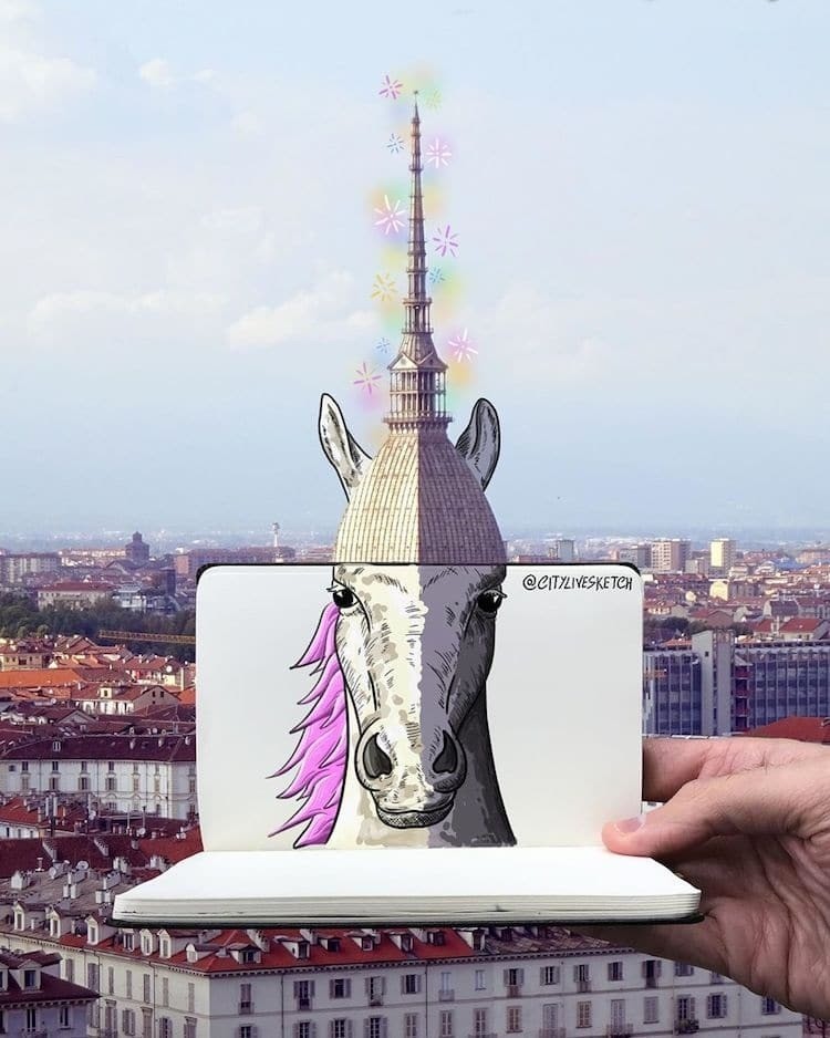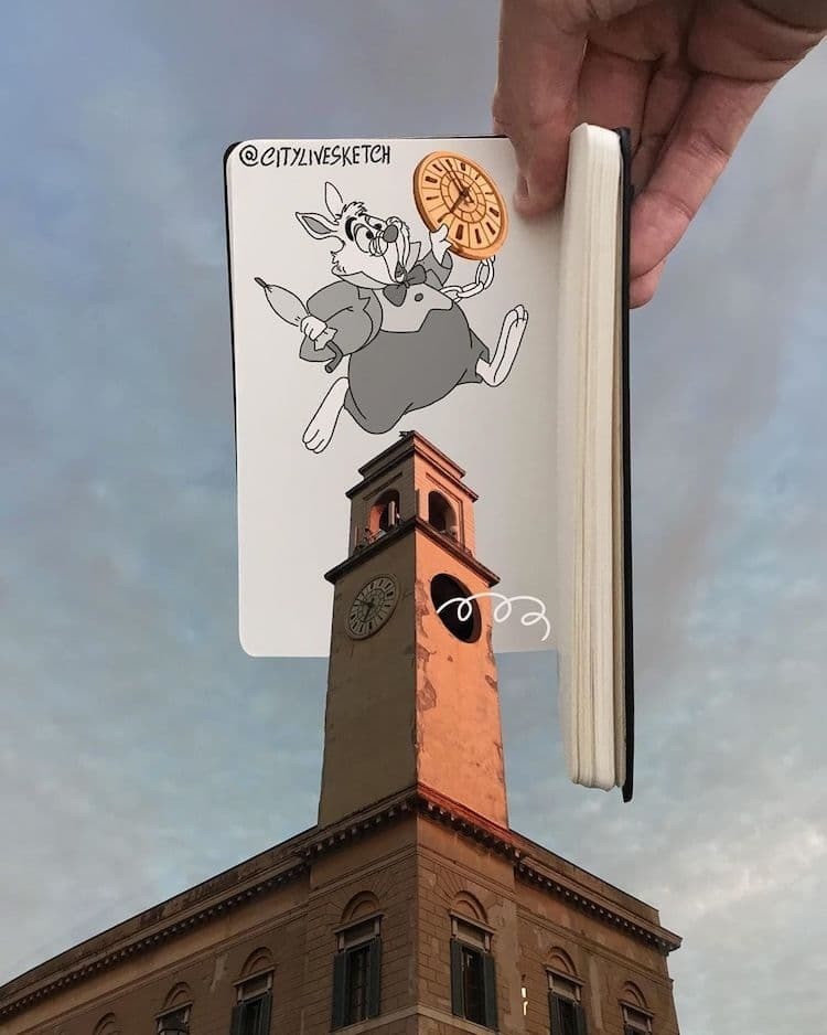 Два года назад художник Пьетро Катауделла начал с того, что создавал трехмерные рисунки самых известных пейзажей мира, которые казалось вот-вот сойдут со страниц его альбома и станут реальными. Сегодня он продолжает выводить городские скетчи на новый уровень уже в своем новом проекте CityLiveSketch. В его недавних работах герои мультфильмов становятся одним целым со знаменитыми урбанистическими видами, сливаясь с культовыми зданиями, мостами и другими постройками.