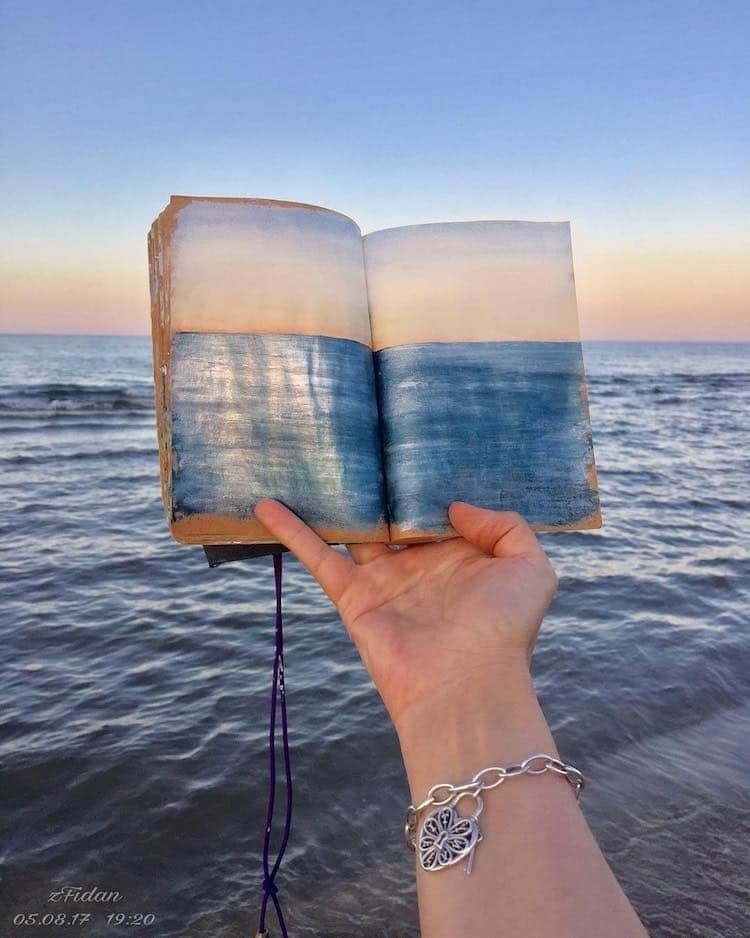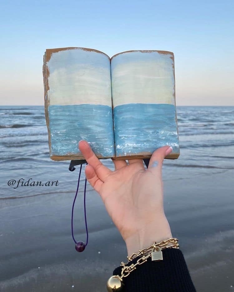 Постоянно меняющиеся пейзажи Каспийского моря Фидан воссоздает акриловыми красками на двухстраничных разворотах. Пенистые волны изображены с помощью текстурированных мазков белого, а сцены заката изумительно передает мягкий градиент. Результатом являются завершенные, самодостаточные работы, которые выглядят как снимок пейзажа.